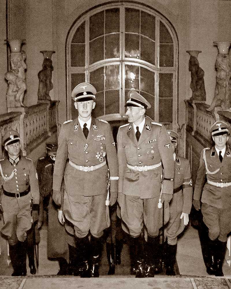 Reinhard Heydrich (on left) at Prague Castle. His predecessor in control of the Czech lands incorporated into Germany, Konstantin von Neurath, was effectively pushed aside and sent on leave because he was felt to have been too soft on the Czechs. Heydrich cracked down on any manifestations of Czech nationalism, but the rewards he gave to workers in key industries increased productivity.
